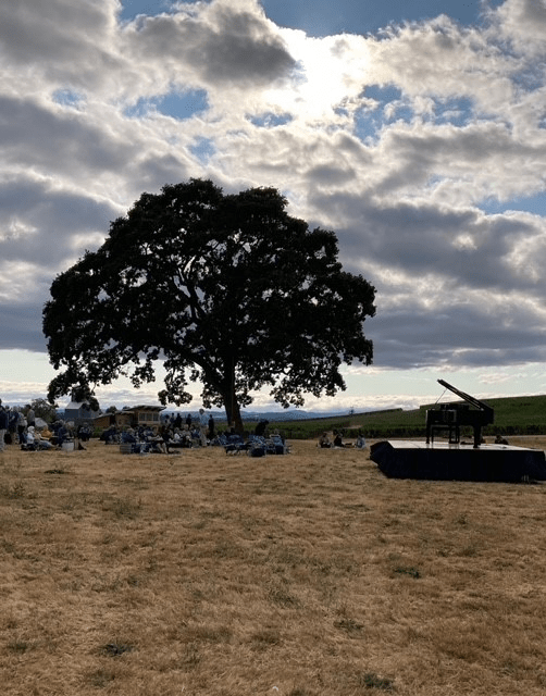 Music. Free park concerts came back, and we had a few behind a music store just a couple of hundred feet away. Sharon has rejoined a recorder group; the Lake Oswego Concert Band is not up and running yet. We went to an outstanding piano concert at a vineyard – part of a program called “In a Landscape”( see pic).