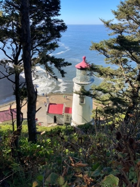 Travel. We had a cruise to San Francisco scheduled for April 2022, but Princess cancelled. We did have a three-fer hiking trip to Yachats (spelled Yachats but pronounced Yah-hots). We got a whale sighting, lots of beaches, a lighthouse (see pic), and a firsthand look at the labor shortage – limited business hours and closures. Our trip to Astoria got us beer, lots of beached sea jellies, pelicans, eagles, and a good walk with friends. Sharon travelled vicariously with her Sis to Iceland, MI, and the Greek Islands.
